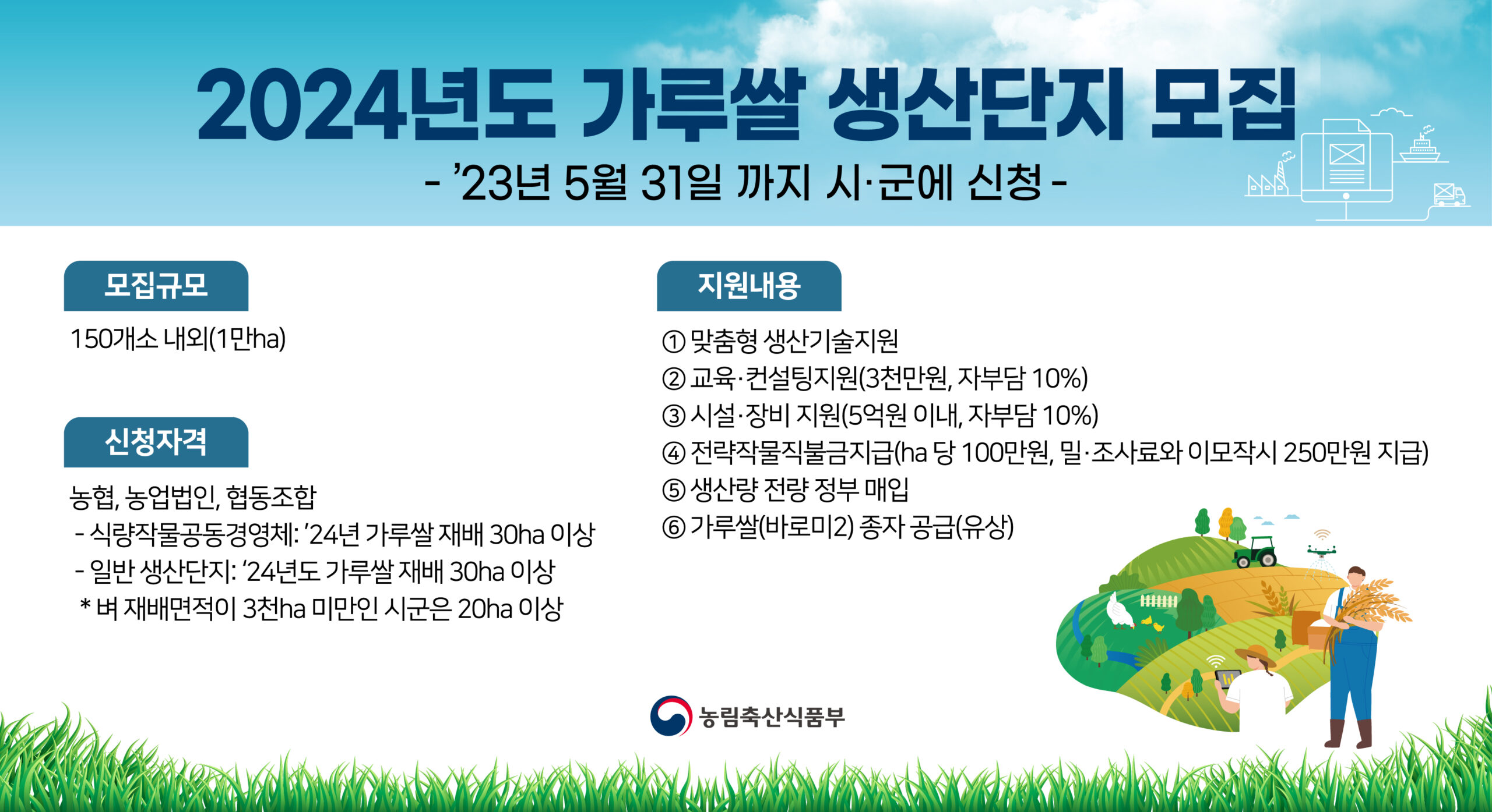 농림축산식품부(장관 정황근, 이하 농식품부)는 “2024년도 가루쌀 전문 재배단지 육성사업” 지원 대상자를 모집한다.