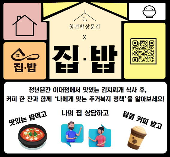 집·밥 프로젝트는 다양한 상황에 처한 청년이 국가의 주거정책에 대한 정보를 쉽게 이해하고, 필요에 따라 적절한 시기에 활용하기 위한 청사진을 제시한다. 첫 활동으로 청년 관련기관, 지자체 등과 연계한 ‘찾아가는 현장상담’과 ‘사회관계망서비스(SNS)를 통한 소통활동’을 통해 청년층이 실질적으로 필요로 하는 정보를 찾아 다양한 방식의 협업을 통해 공유한다.