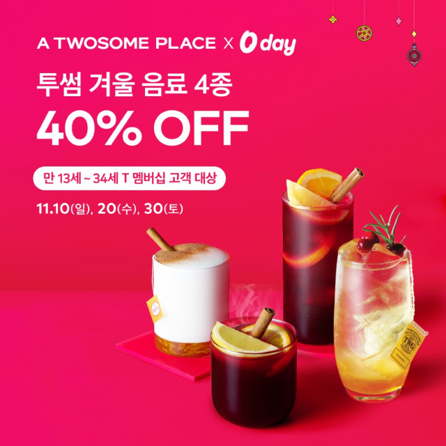 아울러 11월 ‘SKT 0 day’ 프로모션 참여 방법은 간단하다. 만 13세부터 34세에 해당하는 SKT T 멤버십 회원이라면, T 멤버십 앱 내 ‘0 day’ 이벤트 페이지에서 투썸 겨울 음료 할인 쿠폰을 다운로드해 기한 내 사용하면 된다. 프로모션 총 3회 중 1회에 한해 할인 쿠폰을 다운로드해 원하는 음료 1종의 할인을 누릴 수 있다. 또한 투썸플레이스의 11월 ‘SKT 0 day’ 프로모션에 관한 자세한 내용은 T 멤버십 앱과 투썸하트 앱 내 이벤트 페이지를 통해 확인할 수 있다.