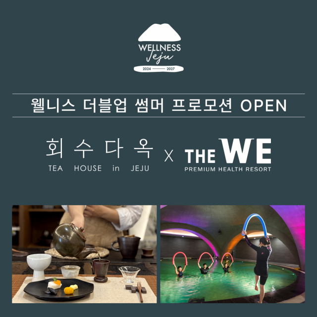 회수다옥과 WE호텔제주의 ‘웰니스 더블업 썸머 프로모션’은 7월 28일부터 8월 31일까지 여름 한정으로 시범 운영한다. 회수다옥의 대표 상품인 ‘제주프리미엄 티 맡김차림’과 WE호텔제주가 투숙객 전용으로 선보이던 ‘위, 힐링위드유’ 프로그램에서 2가지를 선택해 50% 할인된 10만원에 즐길 수 있다. WE호텔제주 숙박 없이 당일 이용도 가능하다.
